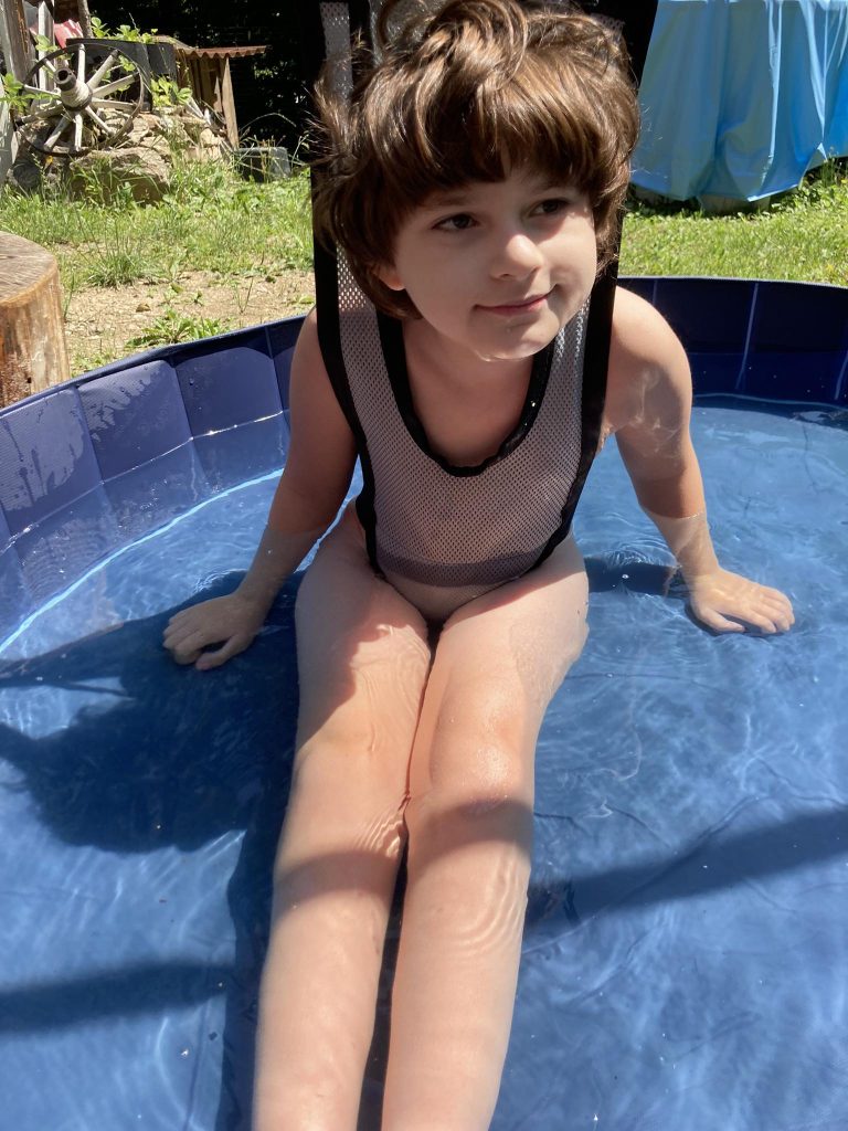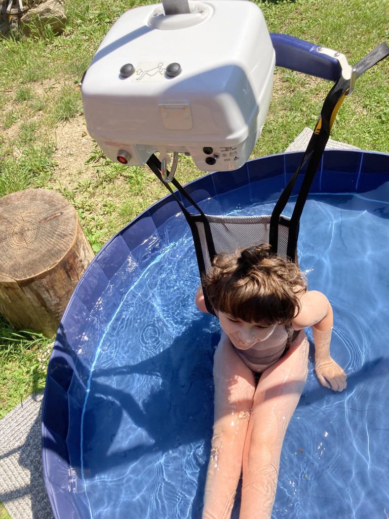 V lete sa Maximko nesmierne teší z vody. Zakúpili sme mu aj skladací bazén a umiestnili ho pod motor stropného zdviháku, takto Maximko môže bezpečne sedieť v bazéne a môžeme ho aj dvihnúť na nôžky. Má z toho ozaj radosť.