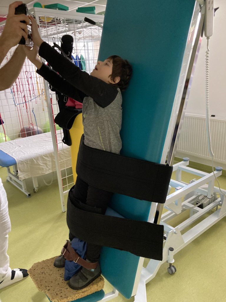 Maximko vie krásne štvornožkovať, keď chce. Vie už krásne sedieť na obyčajnej detskej stoličke, pohojdá sa aj sám na hojdacom slimákovi, snaží sa komunikovať, krásne zvuky vydáva. Trénujeme už aj chôdzu, čo je už, čo povedať, lebo na chôdzu je potrebné, aby bol Maximko celý spevnený a mal vypracované svalstvo. Na státie používame dynamické ortézy od Protetiky vyrobené na mieru, ktoré sme si dali podlepiť brásenou kožou, aby boli príjemnejšie na státie ako priamo stáť na plaste.